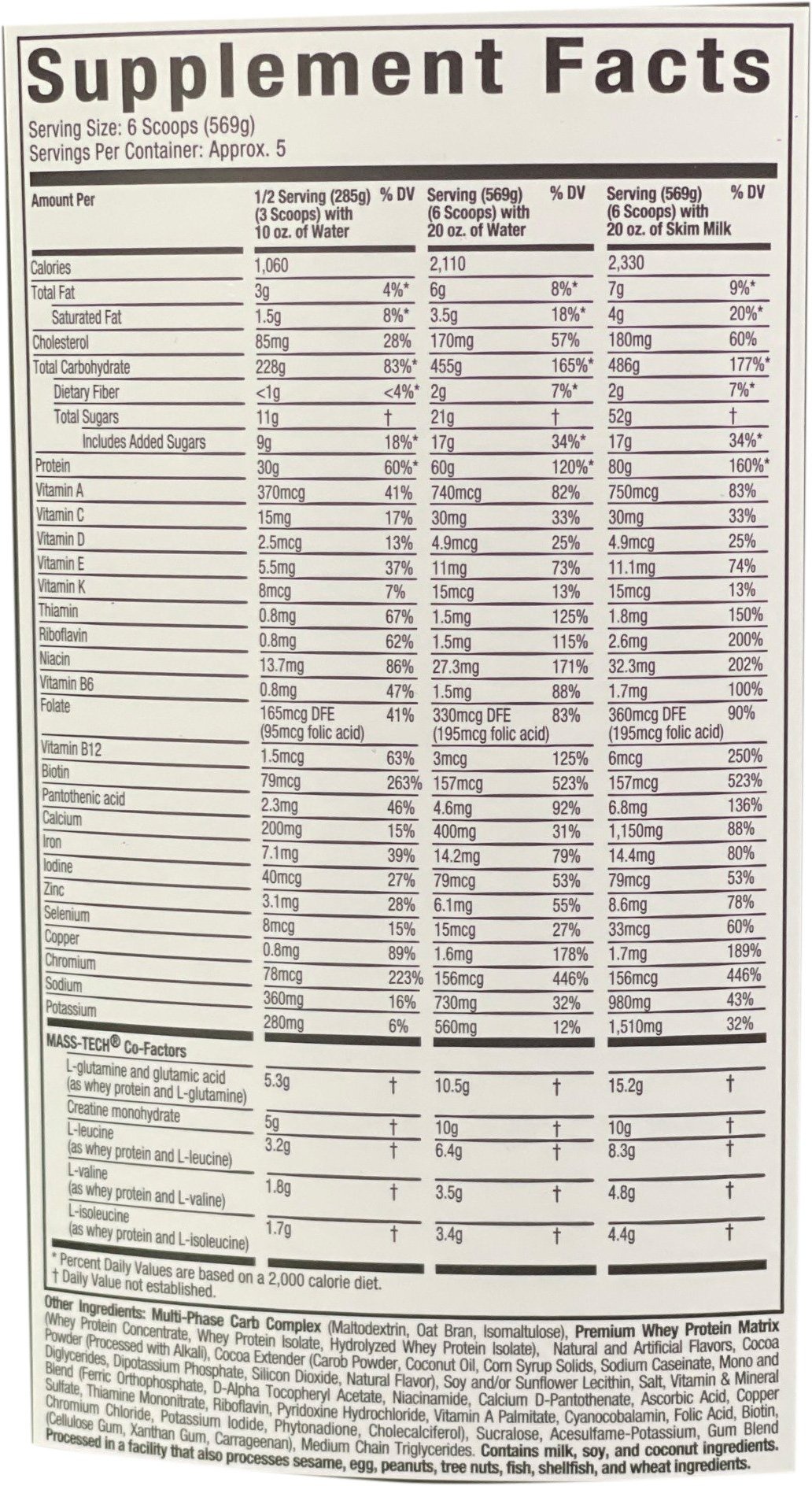 MASS-TECH® EXTREME 2000 cung cấp hơn 2000 kcal (khi pha với 600ml sữa tách béo), mang lại từ nguồn Whey protein chất lượng cao và dễ dàng tiêu hóa Carb phức